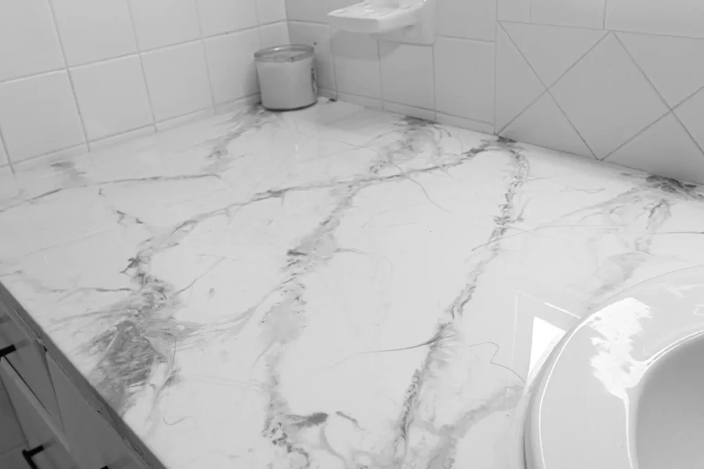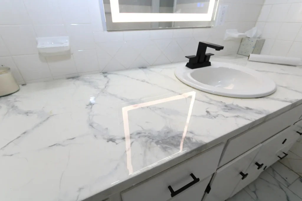 The kitchen includes elegant marble-look countertops.