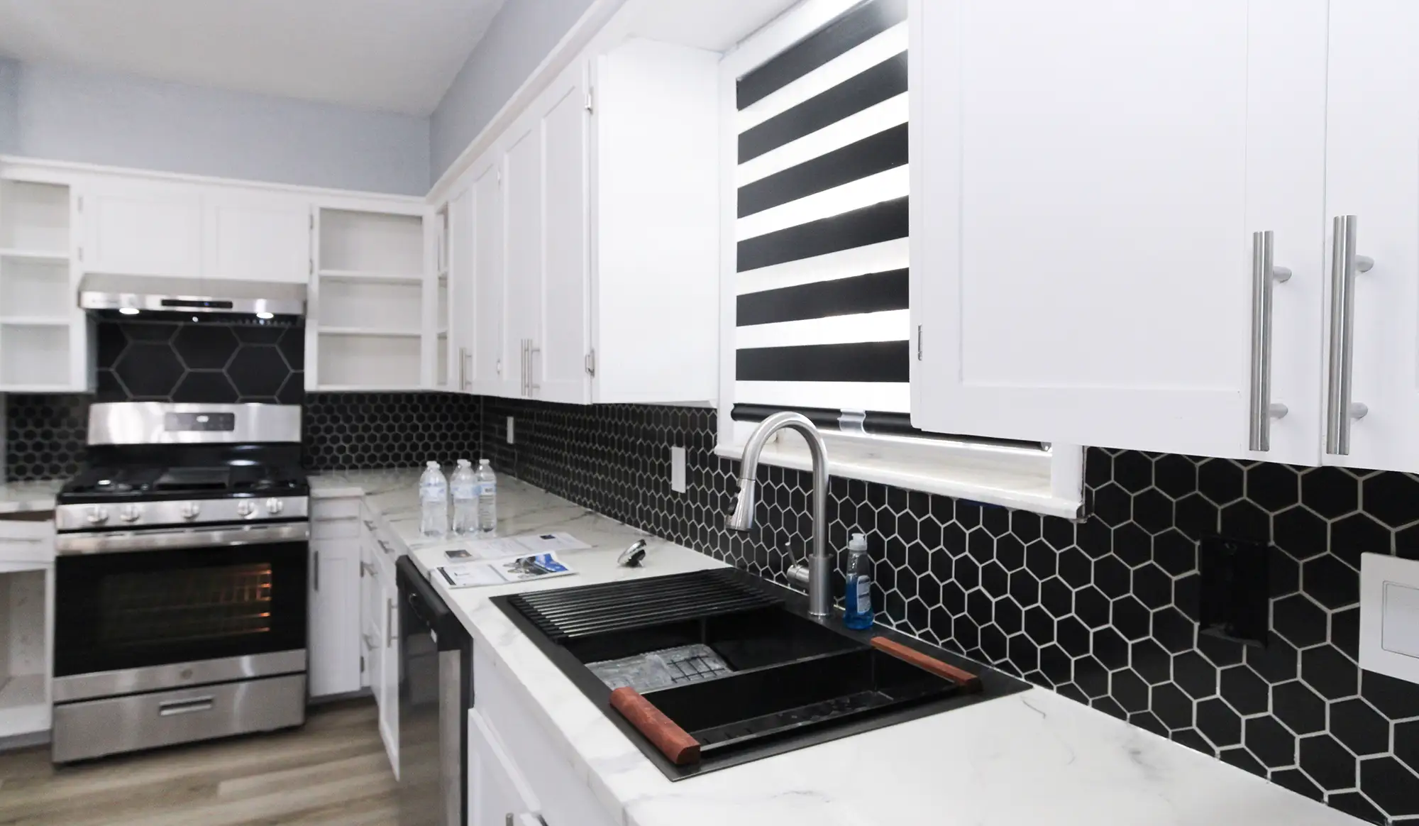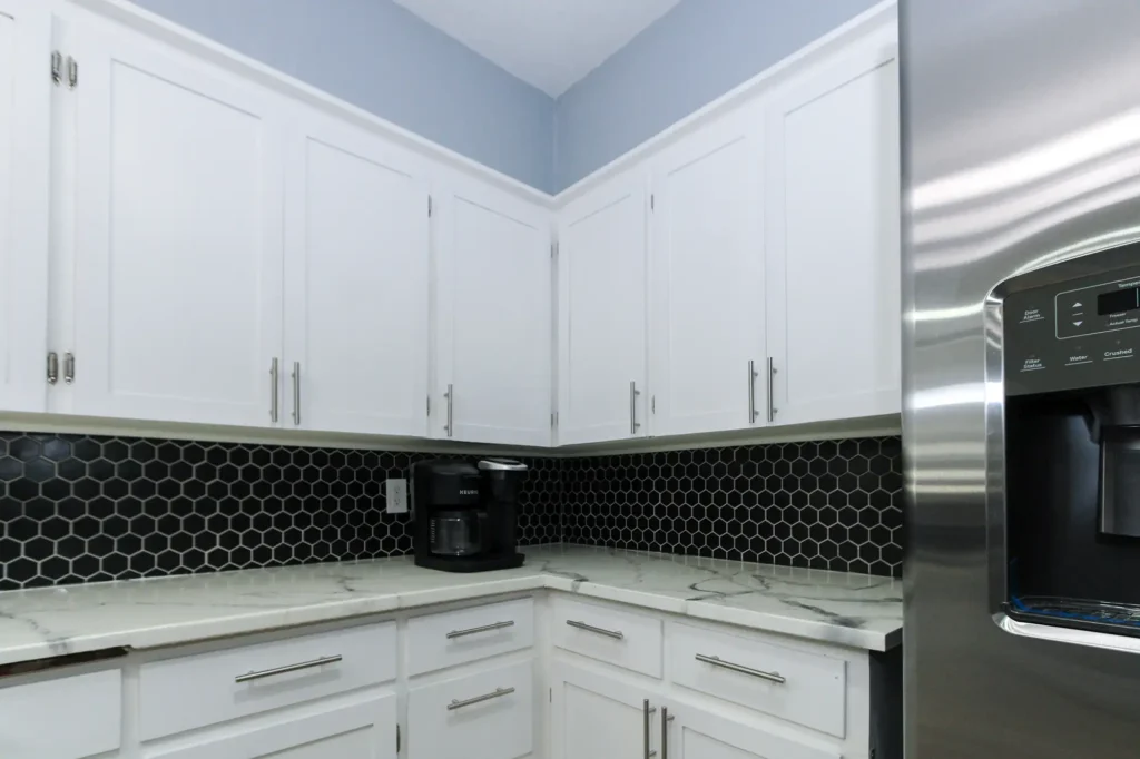Fully renovated kitchen featuring marble-look counters